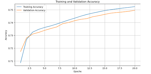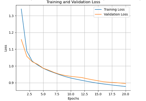 The model is then trained with the fit method using the training dataset (train_ds) and validated on the validation dataset (valid_ds) through 20 epochs. Also, we added a custom callback called DisplayOutputs is used to display model outputs during training. DisplayOutputs essentially converts the tensor numeric representation into textual phrases.